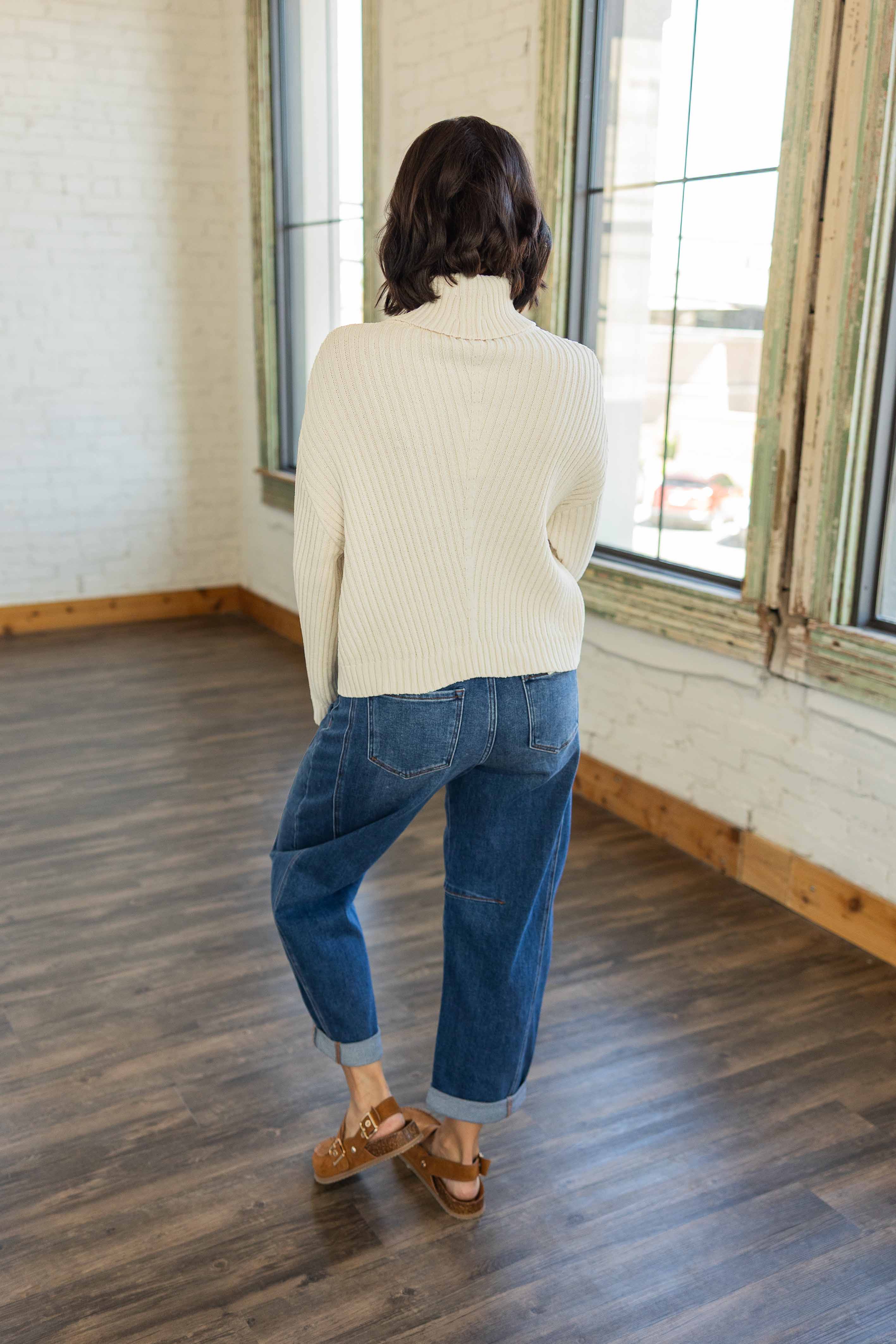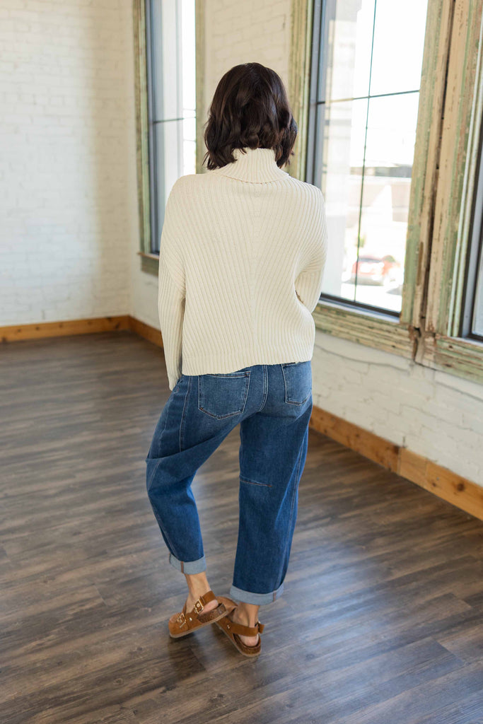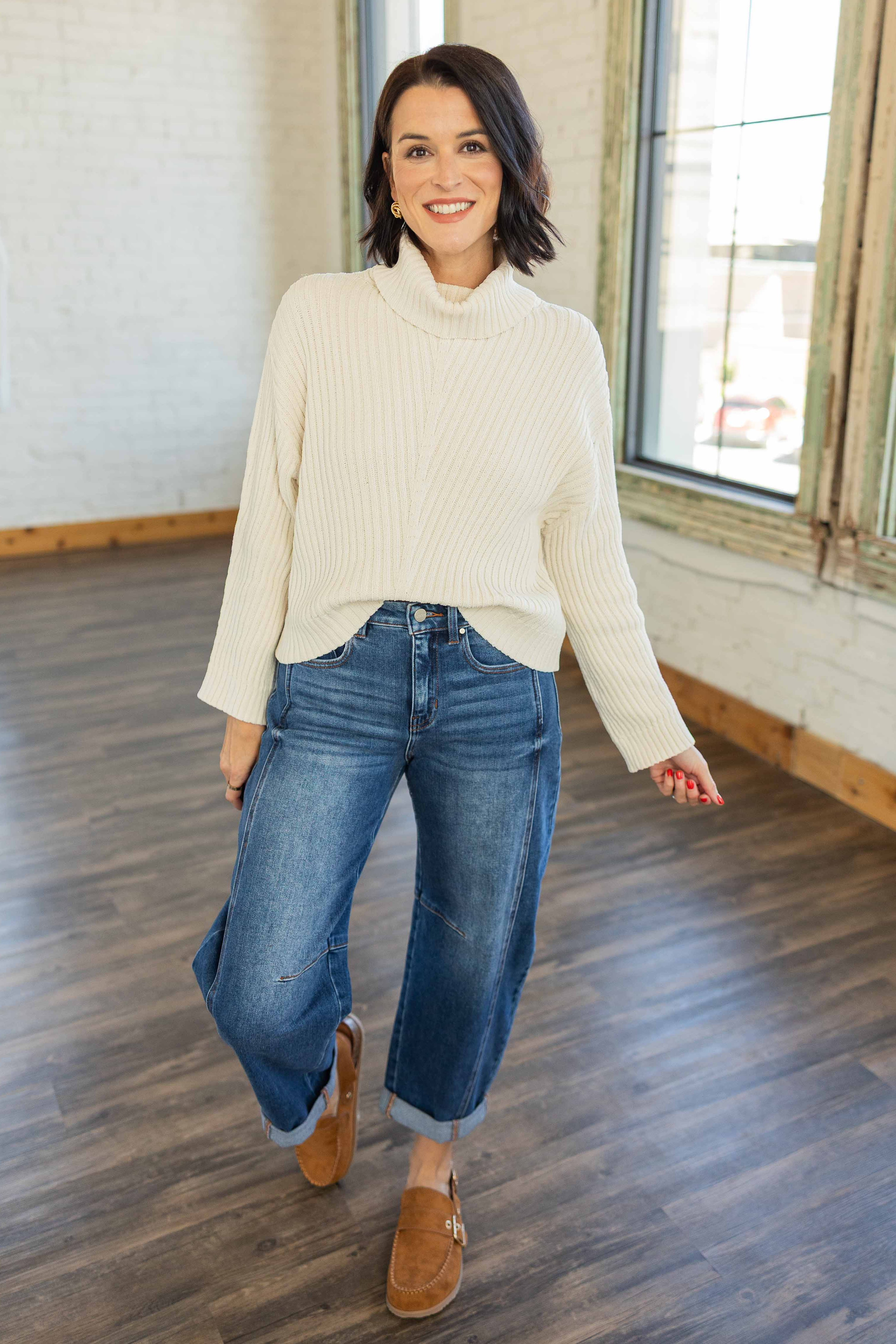 The Alessandra is that cozy cream knit you’ll reach for again and again. It’s got a loose turtleneck, a slightly cropped hem, and a roomy fit that makes it easy to half-tuck or wear relaxed. The ribbed texture gives it just enough structure while still being soft, cozy, and medium weight for Texas “winter.”
