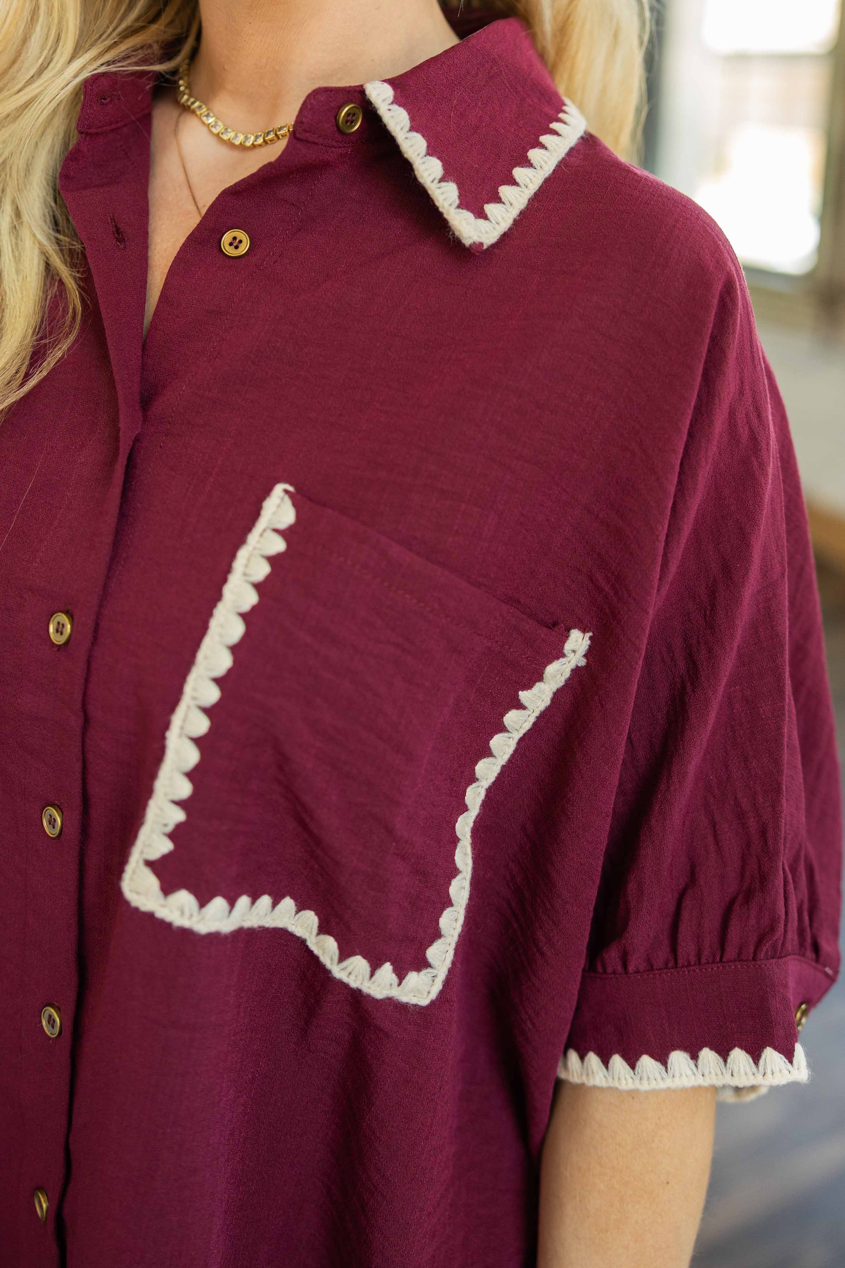 You know that top you throw on when you want to look effortlessly put together but feel like you're still in your comfies? Yeah, this is that top. The Danna Dolman has that perfectly slouchy, roomy fit, textured maroon fabric that gives off “I tried” vibes (even when you didn’t), and the cutest contrast trim that makes it feel just a little extra. The embroidered edge detail on the collar, sleeves, and pocket adds a pop of personality without trying too hard. It's easy, breathable, and basically begging to be worn on repeat.