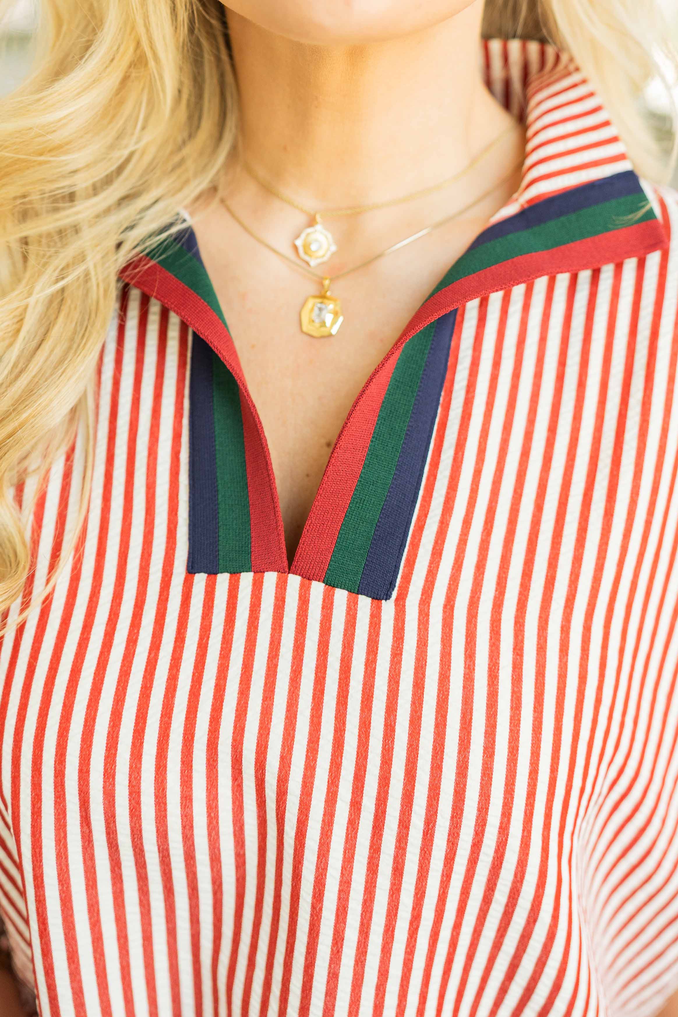 Red + cream vertical stripes with navy + green contrast trim
