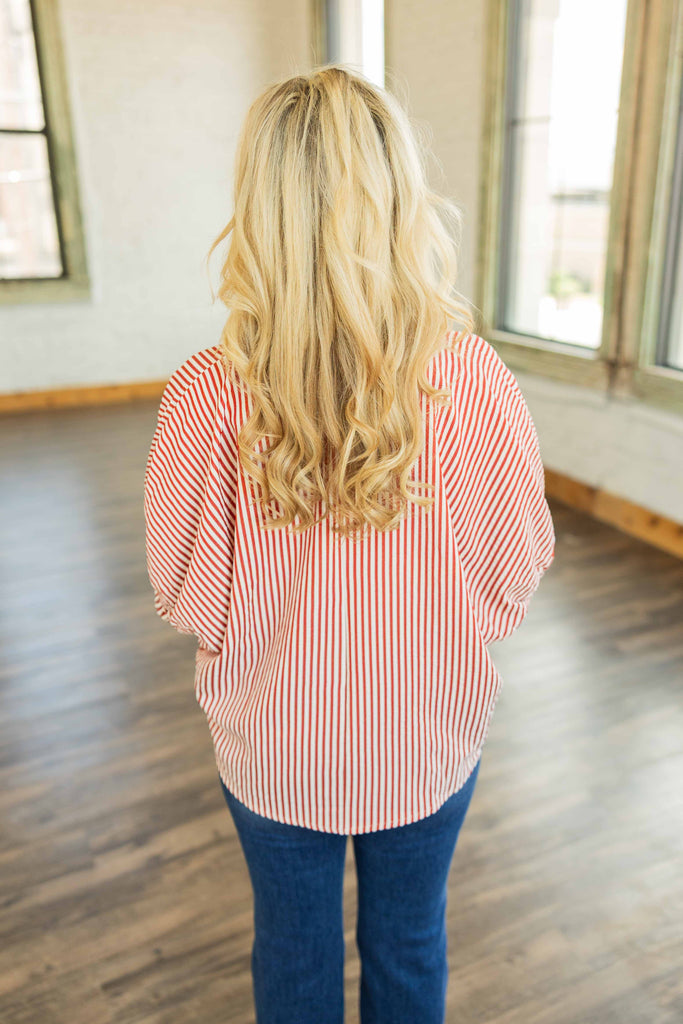 Some tops are cute. Some are comfy. The Antonella Dolman Top? She’s both—with attitude. Featuring a bold red-and-cream vertical stripe print with contrasting green and navy trim, this top is a total standout while still playing nice with your closet basics. The texture is soft and drapey, and the oversized fit? Effortless.