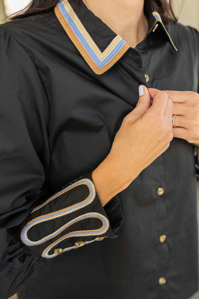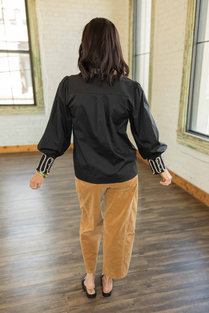 The Danielle top is fall sophistication with a hint of flair. The deep black cotton gives it a crisp, structured feel, while the embroidered accents in shades of caramel, blue, and cream bring just enough personality to make it stand out. Those wide cuffs and puff sleeves add a little drama—in the best way. It’s the perfect statement blouse for layering under vests or wearing solo with denim and loafers.