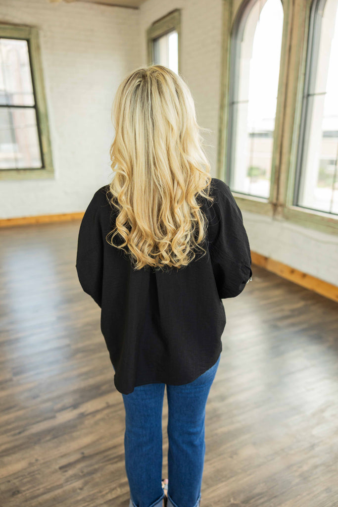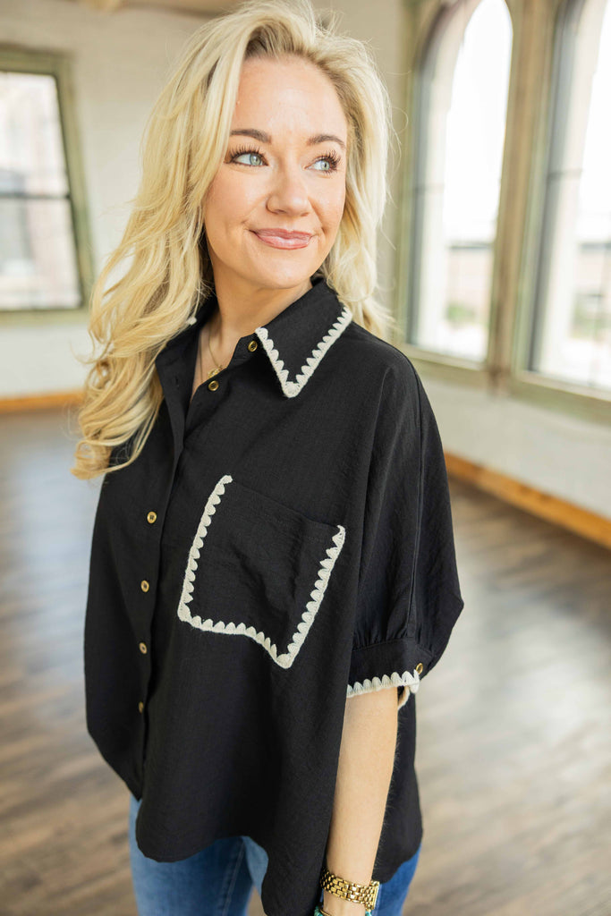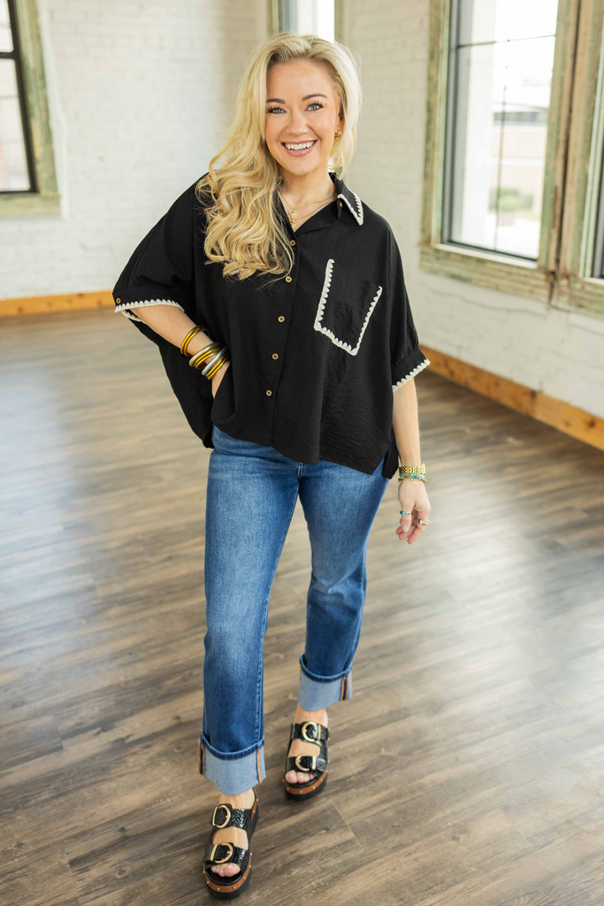 You know that top you throw on when you want to look effortlessly put together but feel like you're still in your comfies? Yeah, this is that top. The Danna Dolman has that perfectly slouchy, roomy fit, textured black fabric that gives off “I tried” vibes (even when you didn’t), and the cutest contrast trim that makes it feel just a little extra. The embroidered edge detail on the collar, sleeves, and pocket adds a pop of personality without trying too hard. It's easy, breathable, and basically begging to be worn on repeat.