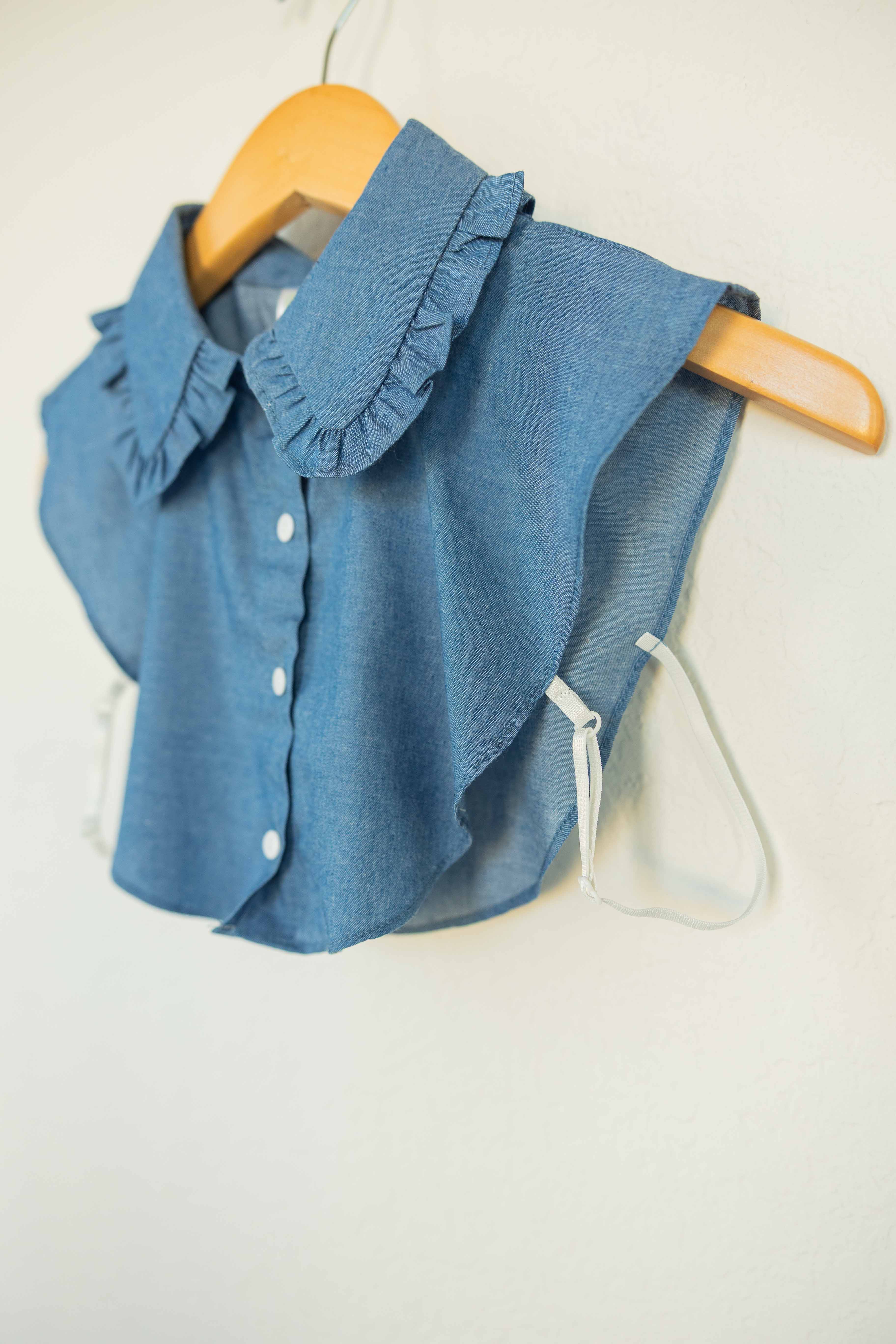The soft blue denim color keeps it classic. The ruffle detail around the collar adds a feminine touch that feels sweet but still a little yeehaw. It buttons up the front and ties at the sides with adjustable straps so you can get the fit just right.