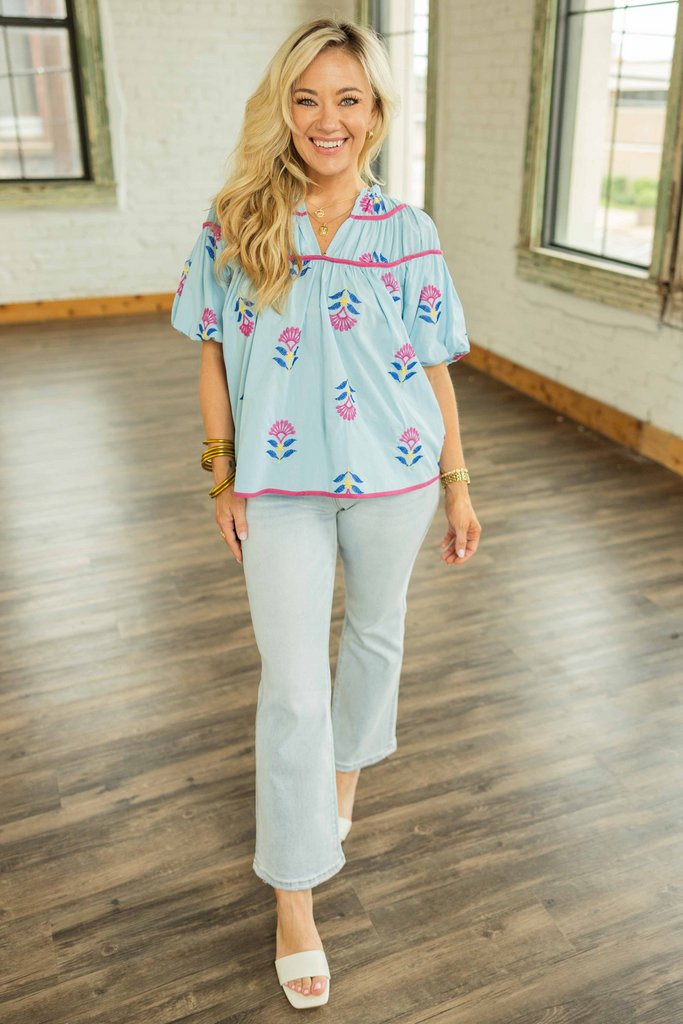Sweet, detailed, and full of charm—the Georgina Embroidered Bloom Top is all about feminine flair. Featuring delicate floral embroidery and a flattering, easy fit, this top brings a soft, romantic feel to any outfit. Whether you're heading to brunch or dressing up your favorite denim, Georgina adds a lovely touch that feels fresh and timeless.
