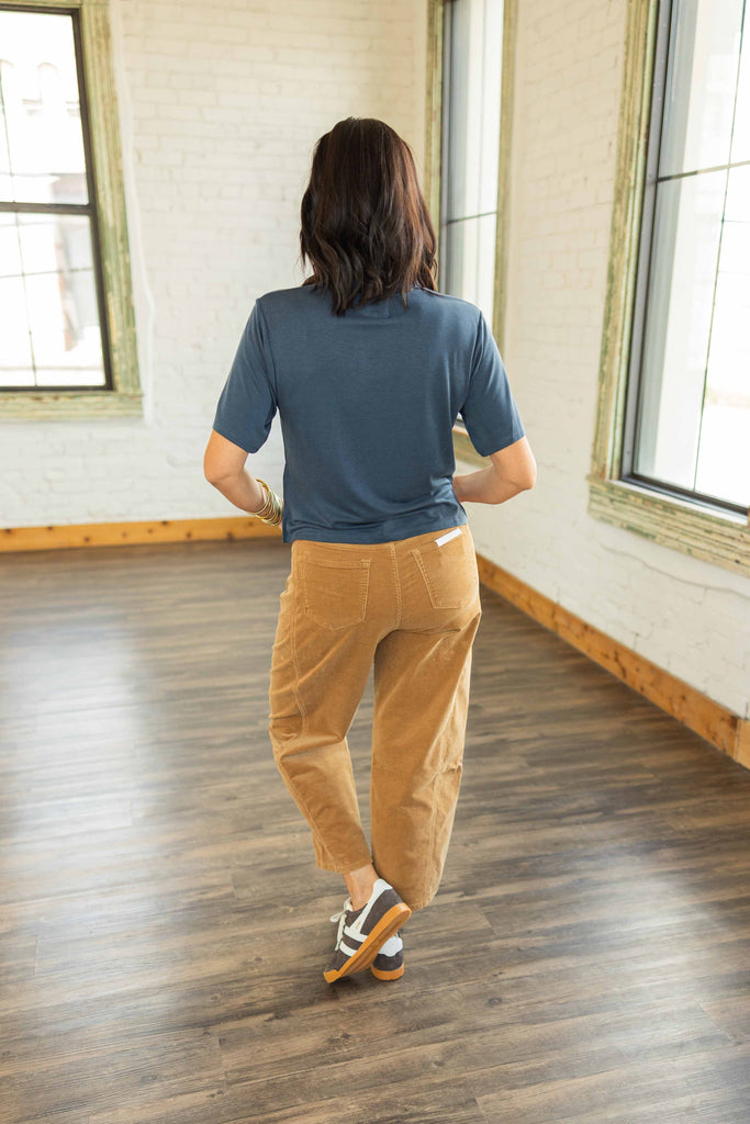 Sometimes simple really does it best. The Helen top is that go-to tee that feels broken in from day one. With its slate blue, soft washed feel and relaxed drape, it’s the kind of top that makes you look put together even when you’re running five minutes late. The slightly cropped length and side slits give it just enough shape to wear tucked, untucked, or half-tucked—your call.