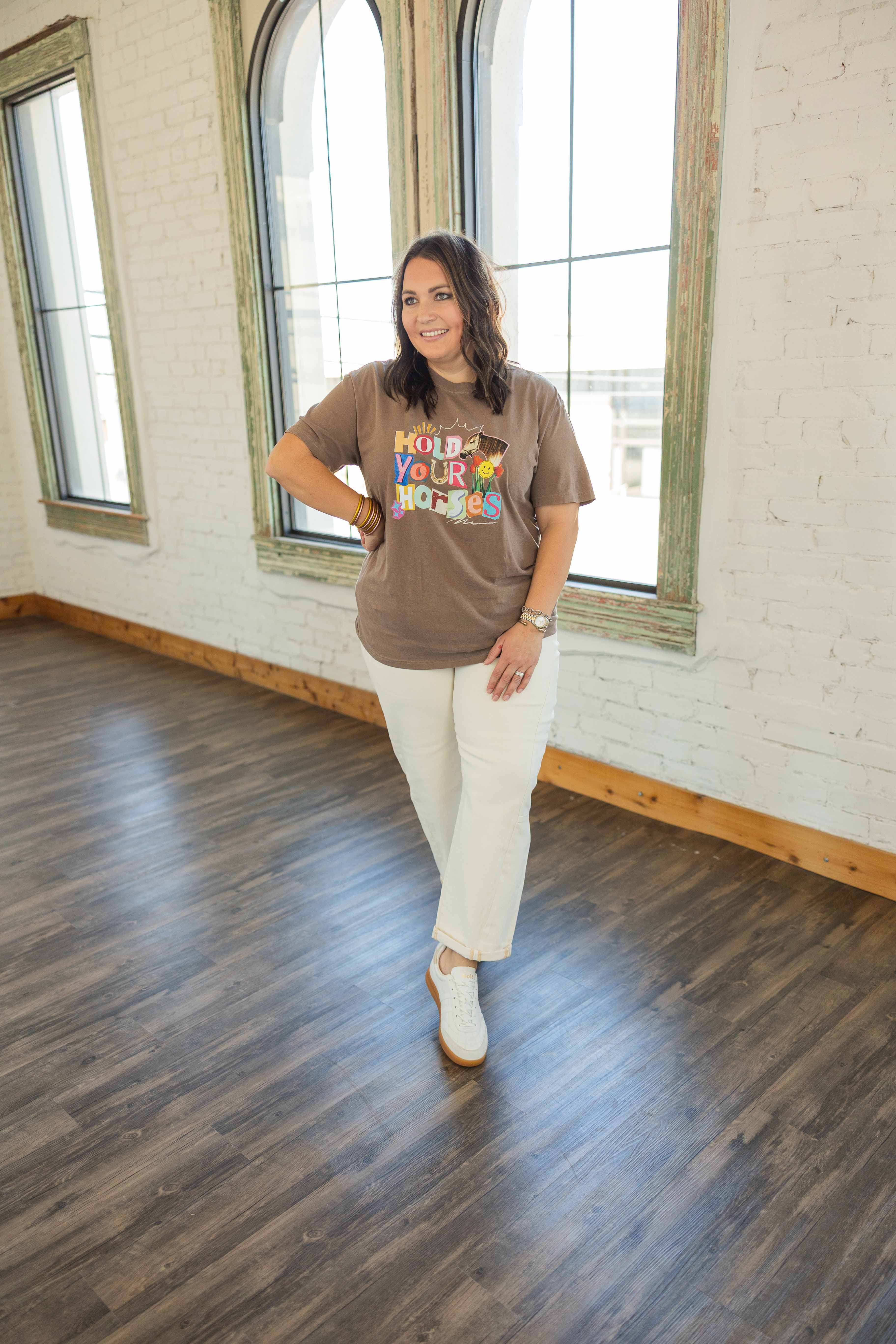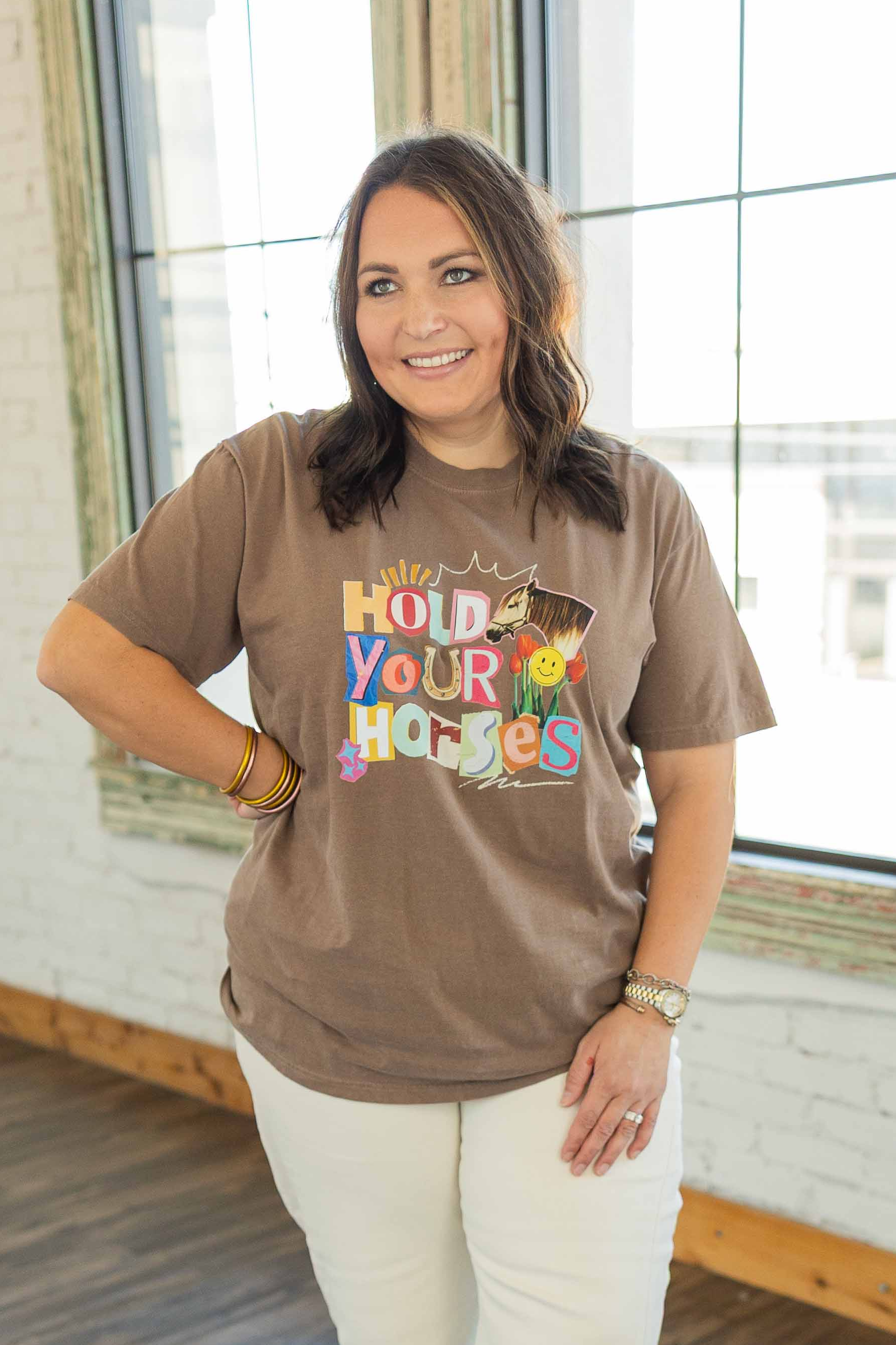 If you have ever told someone to slow their roll, this one is for you. The rich mocha brown tee sets the perfect backdrop for this colorful western graphic. “Hold Your Horses” pops in playful mixed lettering with a horse detail that keeps it on theme for the Yeehaw Edit.
