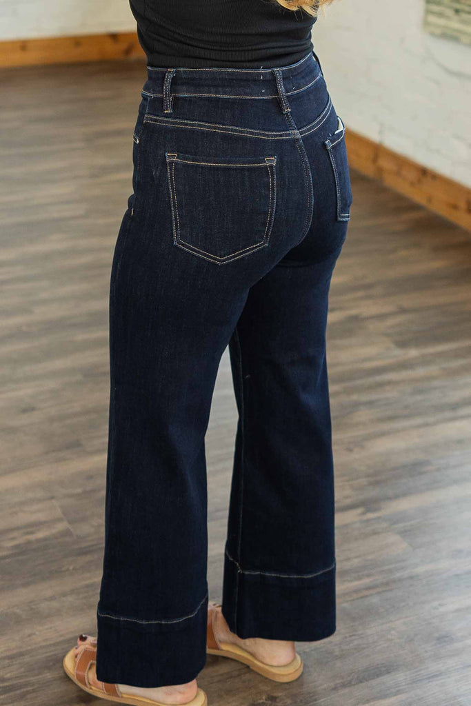 Dark wash denim with a flattering fit that works all day. These cropped wide leg jeans feature a hidden tummy control panel and a seam detail that runs clean down the leg. The high rise holds you in while the slight stretch keeps them comfy.