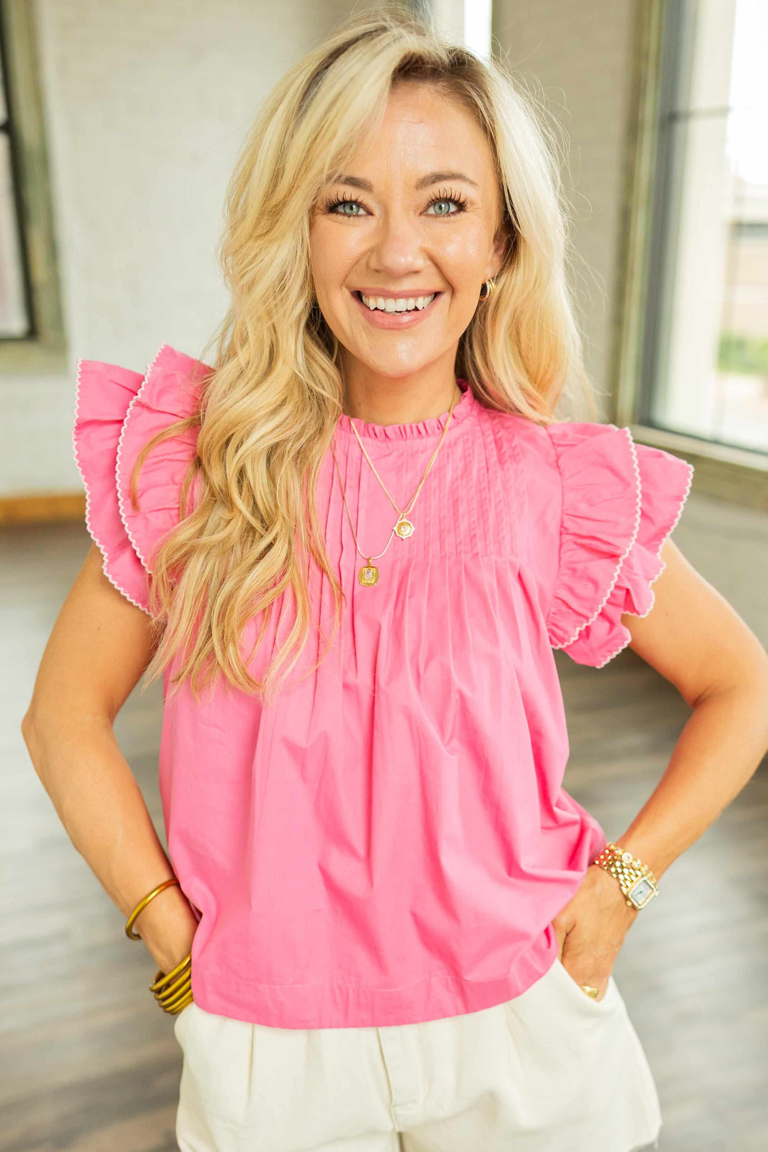 LIVIA FLUTTER CAP SLEEVE EMBROIDERED TRIM TOP