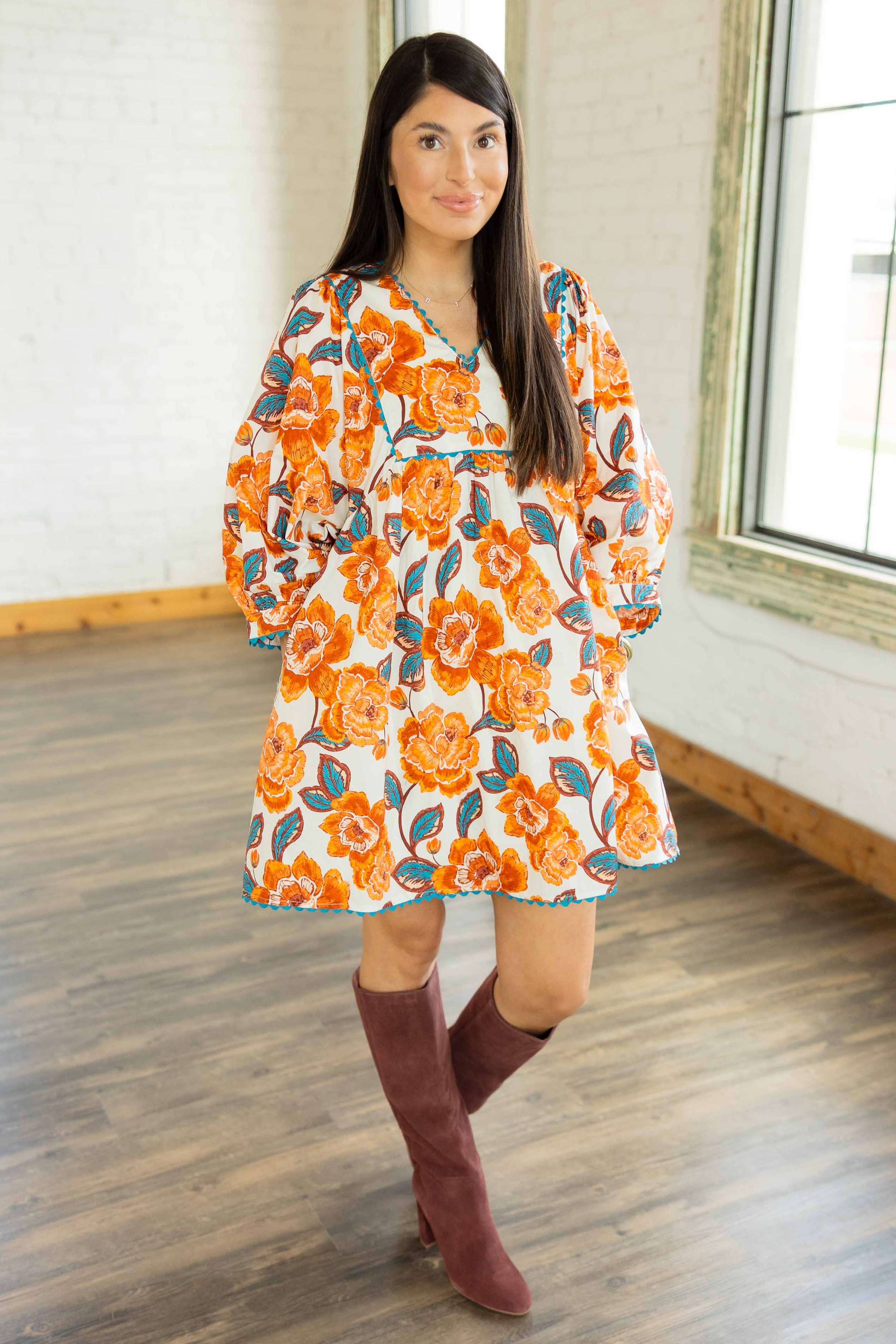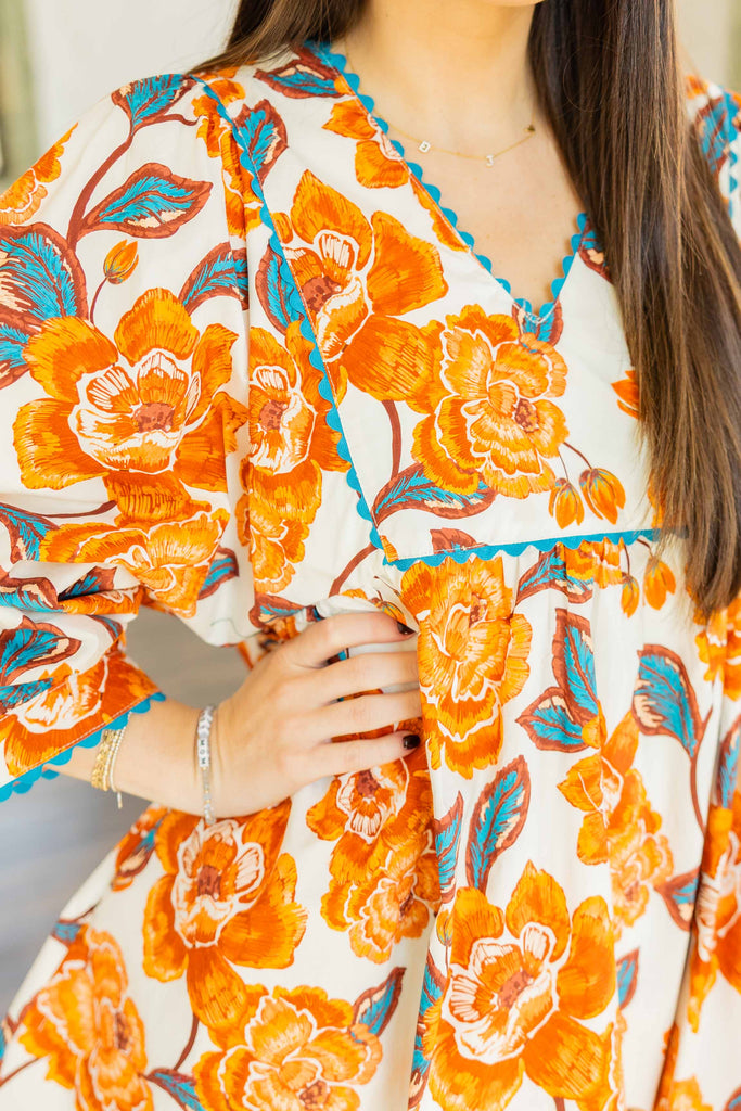 The Noa brings all the fall florals without any of the fuss. This vibrant orange and teal floral mini pops against a cream background, finished with playful rick-rack trim for a retro touch. The flowy, oversized silhouette keeps it breezy and comfortable, while the pockets and lining make it practical enough for real life. Pair it with tall boots for a perfect fall look that feels just as fun as it looks.