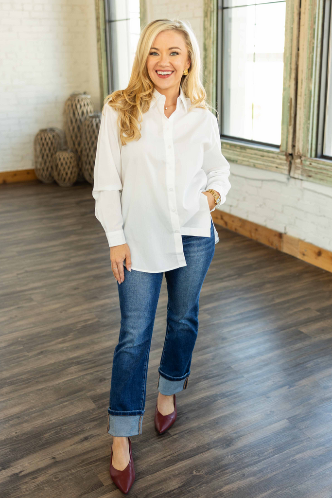 Elevate your wardrobe with this essential white shirt, designed to be your go-to piece this fall and beyond. Its versatile silhouette pairs effortlessly with any bottoms, making it easy to dress up for a night out or keep it casual for everyday wear. Crafted for comfort and style, this shirt is a timeless staple you'll reach for all year round. Don't miss out on the ultimate layering piece!