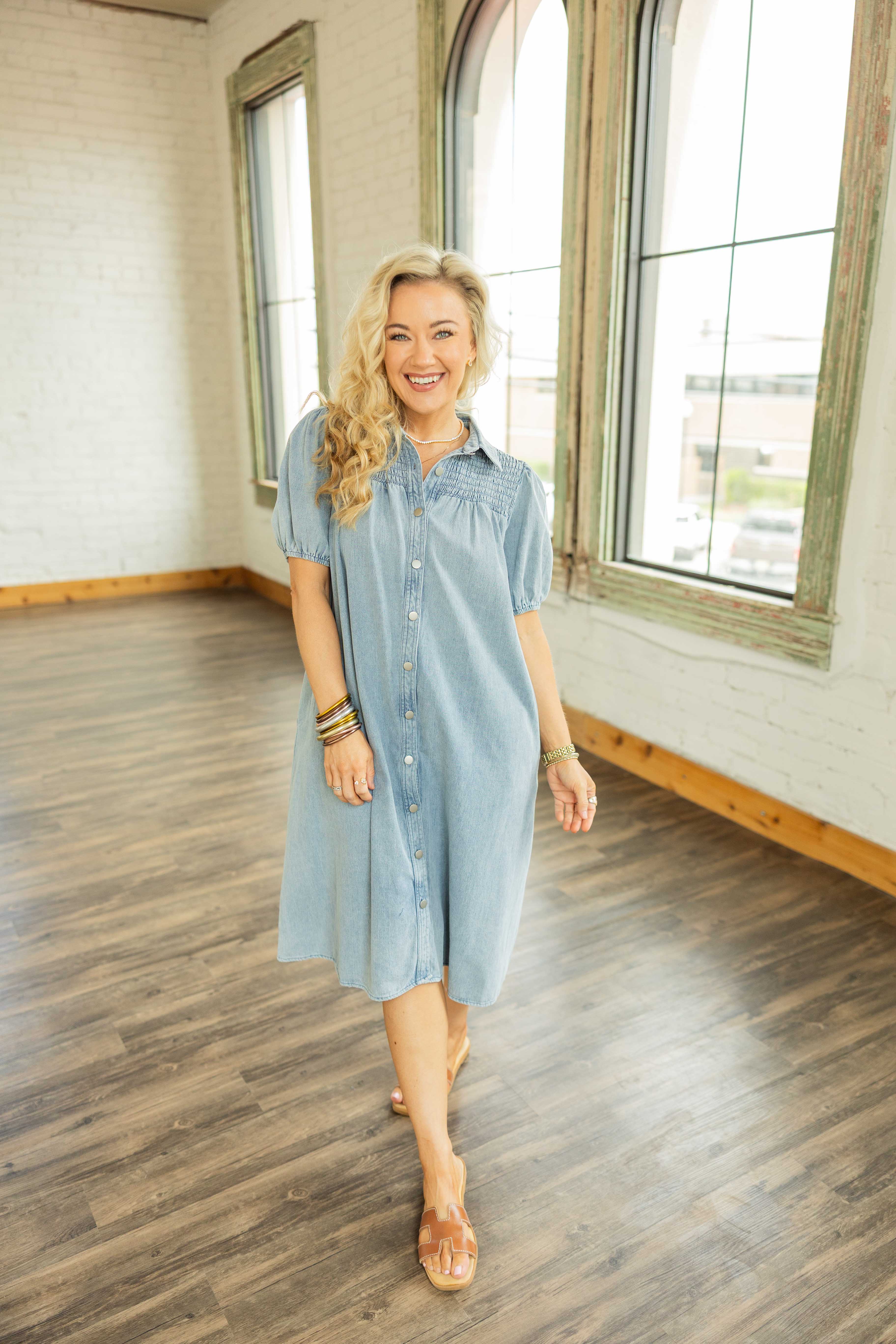 Your denim days just got an upgrade. The Savanna Denim Midi Button Up Dress is that easy, throw-on-and-go piece that still looks pulled together. Soft and lightweight with a lived-in chambray look, this dress features a shirt collar, short puff sleeves, and a functional button-up front. The smocked detail across the shoulders adds a feminine touch, while roomy side pockets keep it practical. The midi length makes it versatile enough to wear with sandals, sneakers, or boots—basically, your closet just found its new best friend.