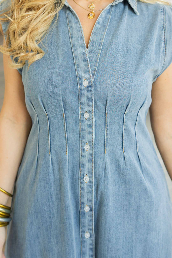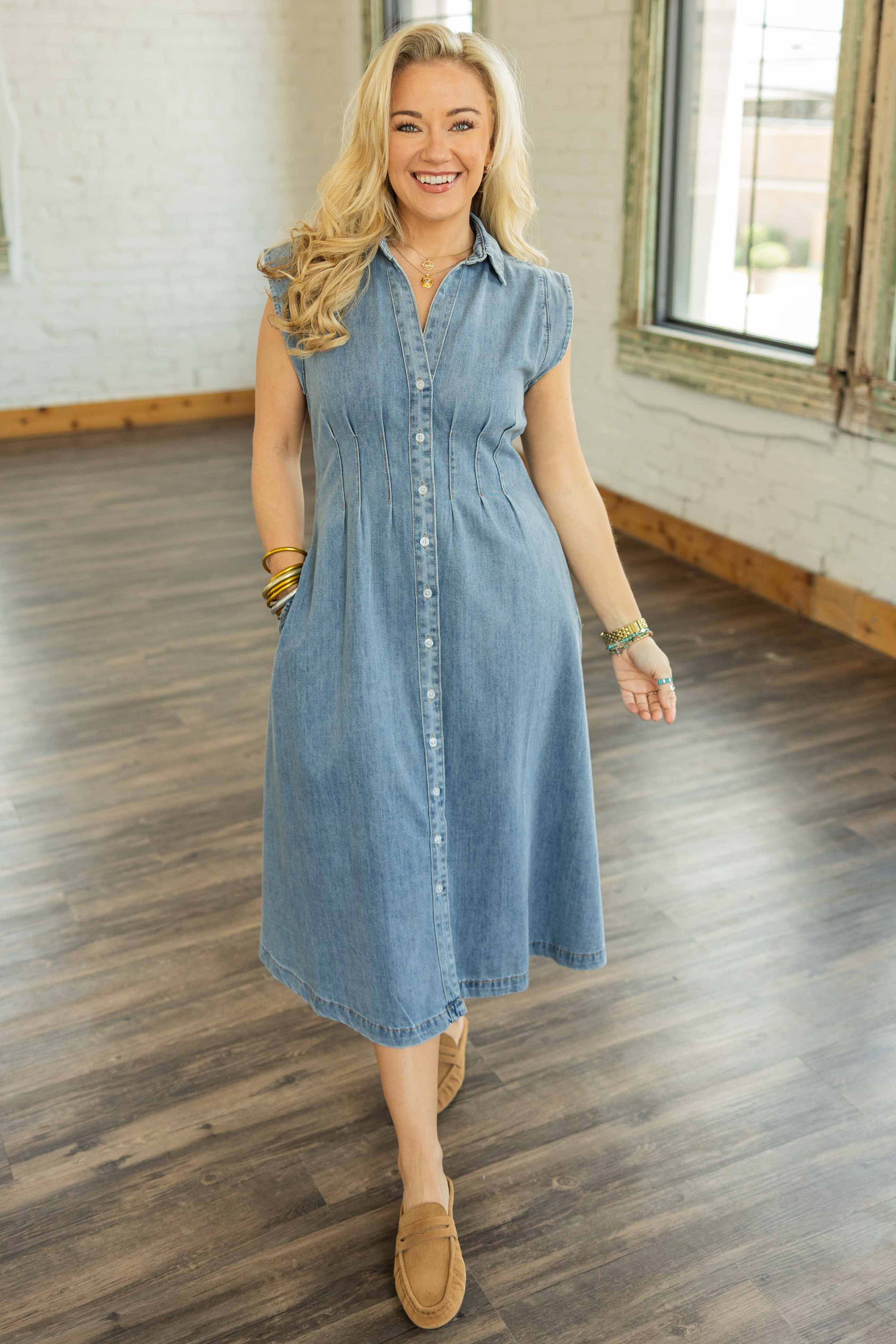 If your fall wardrobe had a main character, this would be her. The Sutton Dress is made from soft, 100% cotton denim in a dreamy washed blue that feels just as good as it looks. With a button-up front, flattering darted seams, and major twirl potential thanks to that flared midi hem, she's equal parts structured and easygoing. Sleeveless with a crisp collar, she's giving "effortlessly put together" energy in every situation—especially with boots. And yep, she has pockets. Bless.