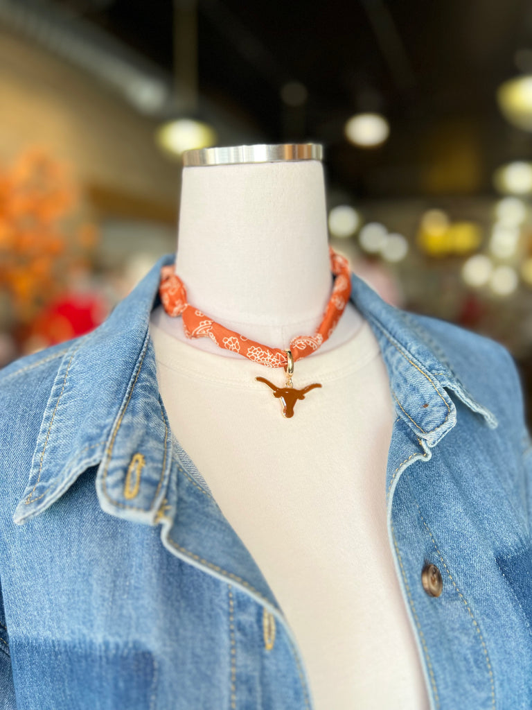 Blend fashion and fandom with the Bandana Scarf Necklace. This versatile accessory features a soft bandana scarf paired with a gold-plated logo pendant for a chic game day look.